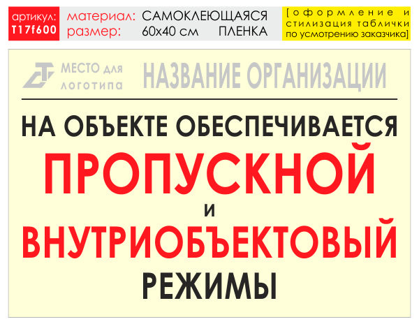 Баннер «Режим» (T17) может быть изготовен в различных размерах на самоклеящейся плёнке, ПВХ-пластике или баннерной ткани (а также на металле - под заказ) как по нашему, так и по Вашему макету или эскизу. В цену баннера включены: разработка и согласование макета, а также изготовление и упаковка. Изготавливаем таблички любых размеров и на любом материале (включая и металл) по Вашим макетам и эскизам