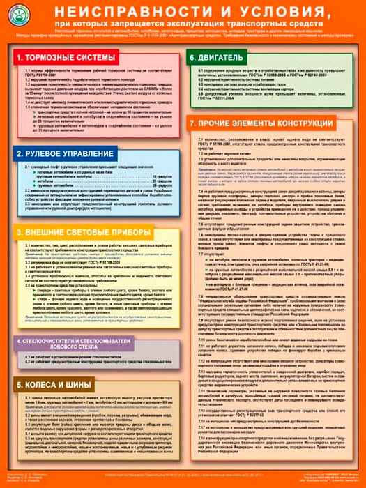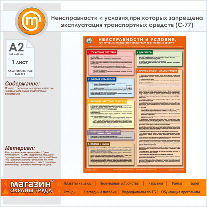 Плакат «Неисправности и условия, при которых запрещена эксплуатация транспортных средств» (С-77, ламинированная бумага, А2, 1 лист) в Улан-Удэ купить