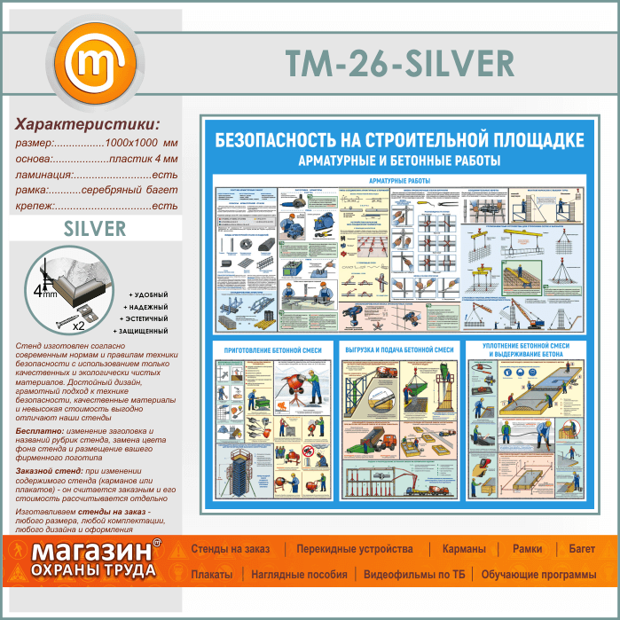 Стенд «Безопасность на строительной площадке. Арматурные и бетонные работы» (TM-26-SILVER) в Улан-Удэ купить