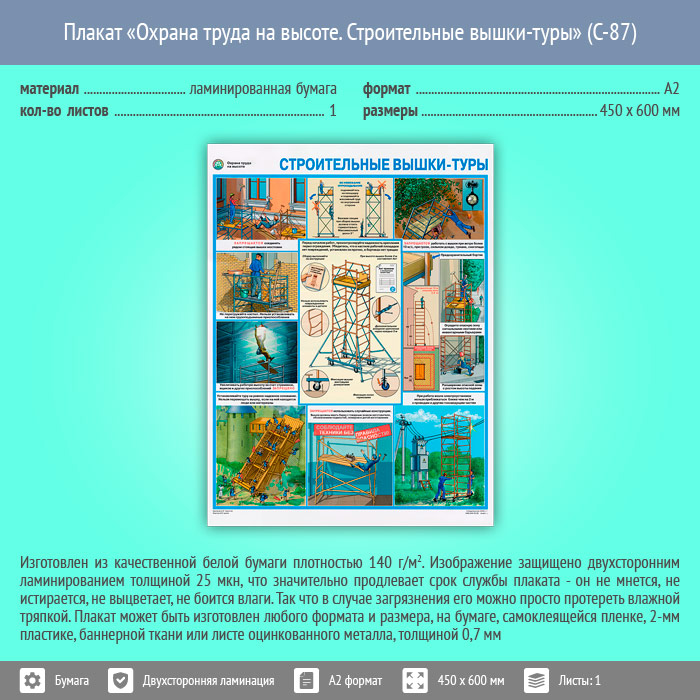 Плакат «Охрана труда на высоте. Строительные вышки-туры» (С-87, ламинированная бумага, А2, 1 лист) в Улан-Удэ купить