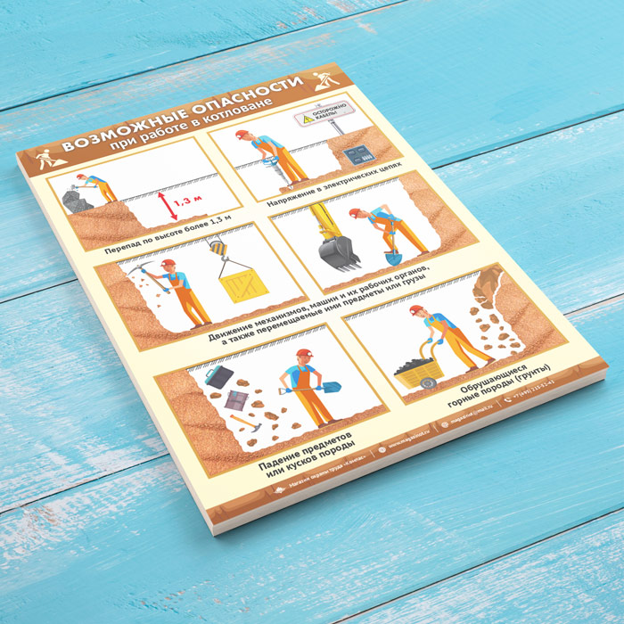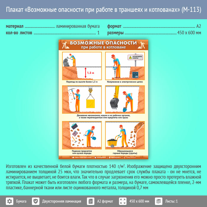 Плакат «Возможные опасности при работе в траншеях и котлованах» (М-113, ламинированная бумага, А2, 1 лист) в Улан-Удэ купить