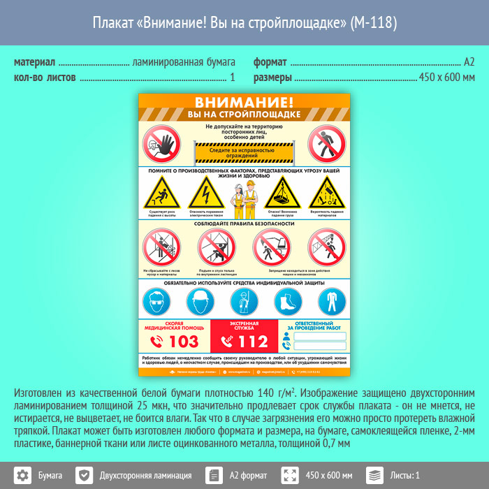 Плакат «Внимание! Вы на стройплощадке» (М-118, ламинированная бумага, А2, 1 лист) в Улан-Удэ купить