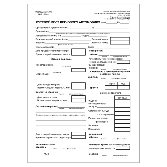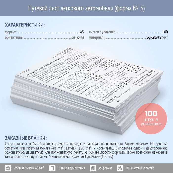 Путевой лист легкового автомобиля (форма № 3, упаковка из 100 штук) в Улан-Удэ купить