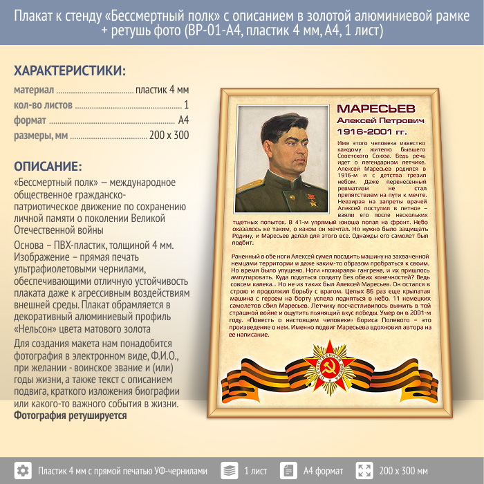 Плакат к стенду «Бессмертный полк» с описанием в золотой (матовой) алюминиевой рамке + ретушь фото (BP-02-A4, пластик 4 мм, А4, 1 лист) в Улан-Удэ купить