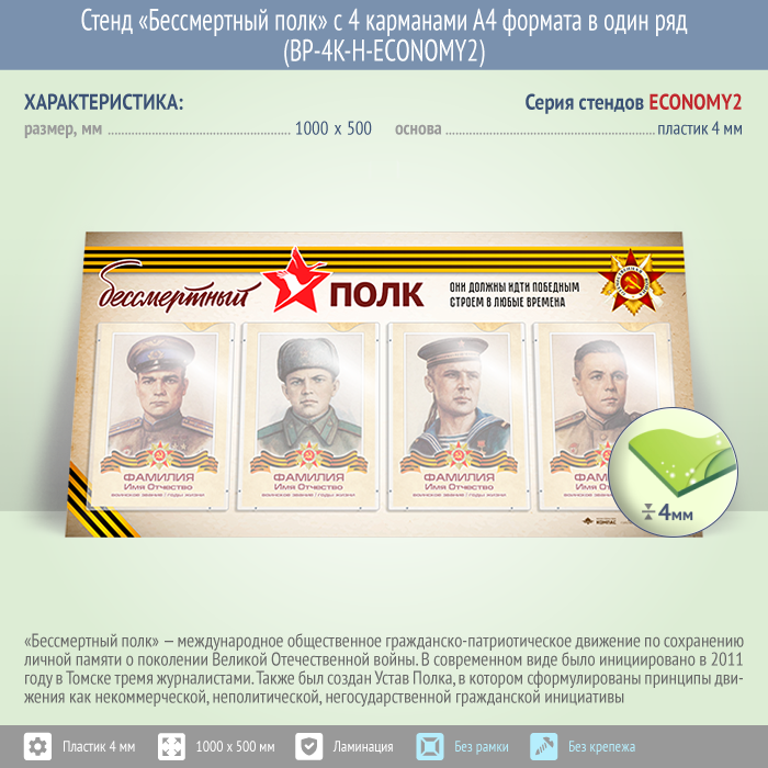 Стенд «Бессмертный полк» с 4 карманами А4 формата в один ряд (BP-4K-H-ECONOMY2) в Улан-Удэ купить