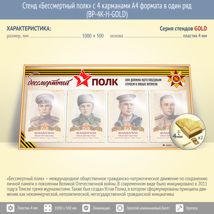 Стенд «Бессмертный полк» с 4 карманами А4 формата в один ряд (BP-4K-H-GOLD) в Улан-Удэ купить
