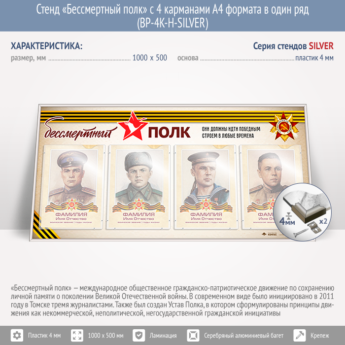 Стенд «Бессмертный полк» с 4 карманами А4 формата в один ряд (BP-4K-H-SILVER) в Улан-Удэ купить