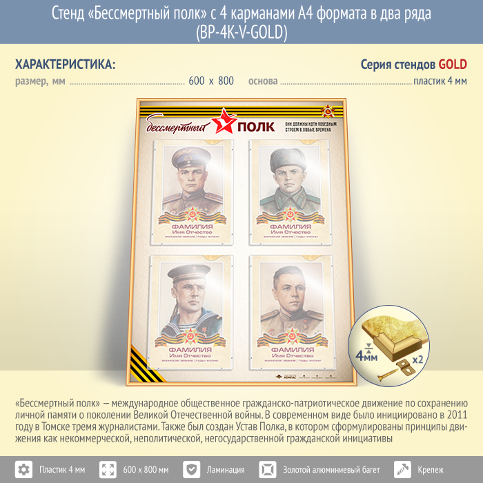 Стенд «Бессмертный полк» с 4 карманами А4 формата в два ряда (BP-4K-V-GOLD) в Улан-Удэ купить