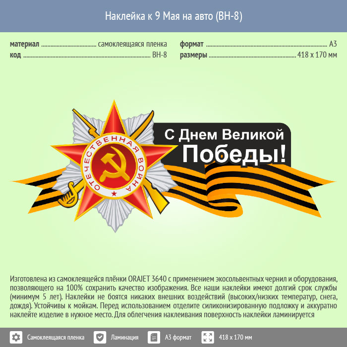 Наклейка к 9 Мая на авто А3 формата (BH-8) в Улан-Удэ купить