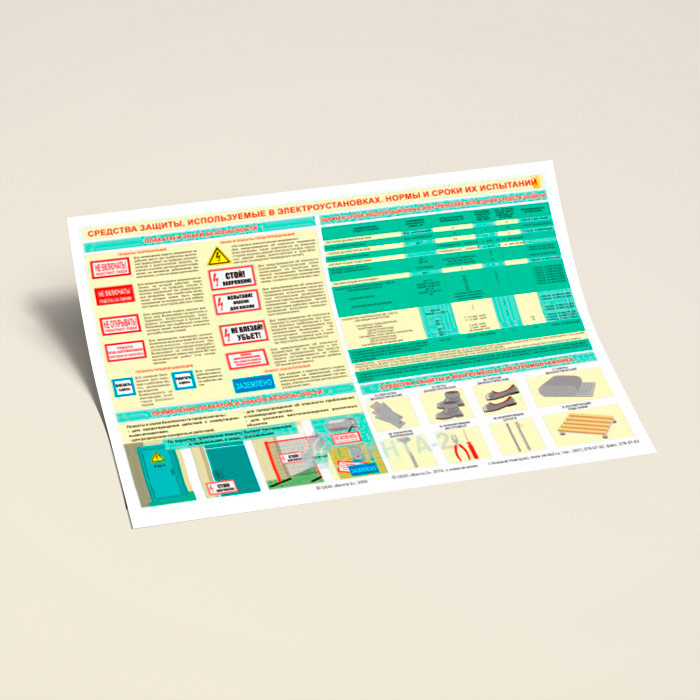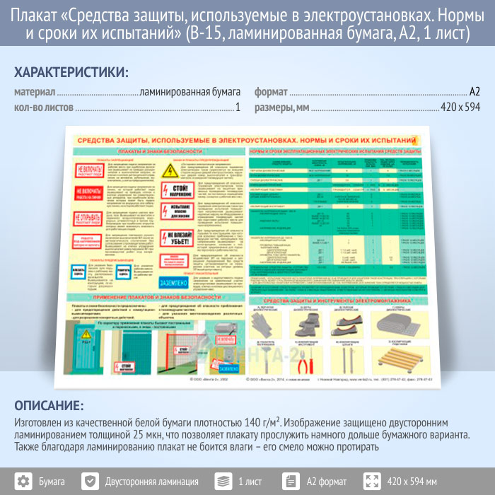 Плакат «Средства защиты, используемые в электроустановках. Нормы и сроки их испытаний» (В-15, ламинированная бумага, А2, 1 лист) в Улан-Удэ купить