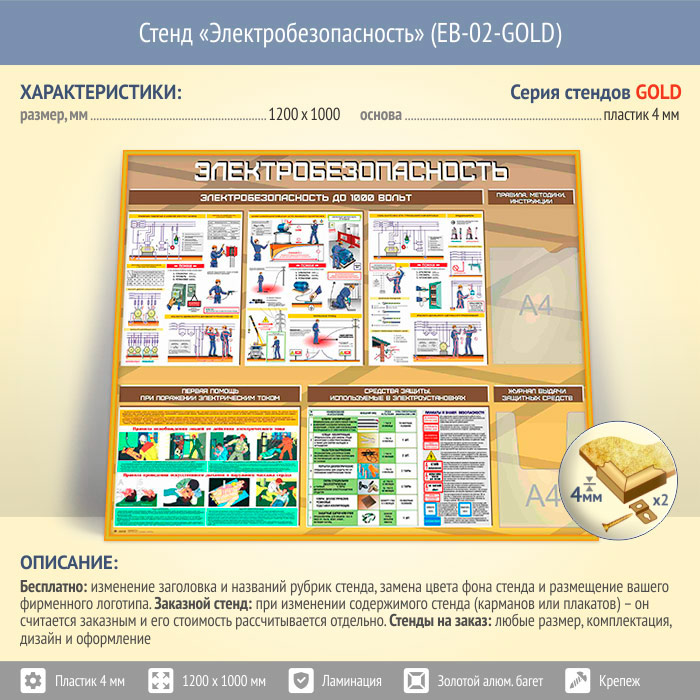 Стенд «Электробезопасность до 1000 вольт» с плоским и объемным карманами (EB-02-GOLD) в Улан-Удэ купить