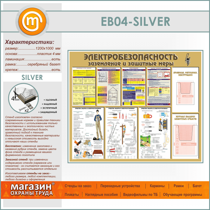 Стенд «Электробезопасность. Заземление и защитные меры» с 2 объемными карманами (EB-04-SILVER) в Улан-Удэ купить
