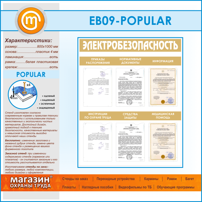 Стенд «Электробезопасность» с 6 карманами (EB-09-POPULAR) в Улан-Удэ купить