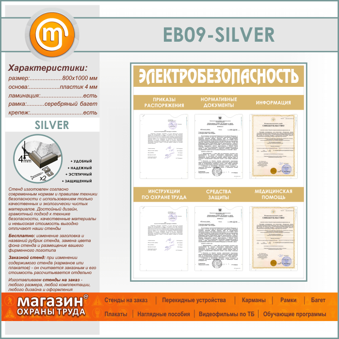 Стенд «Электробезопасность» с 6 карманами (EB-09-SILVER) в Улан-Удэ купить
