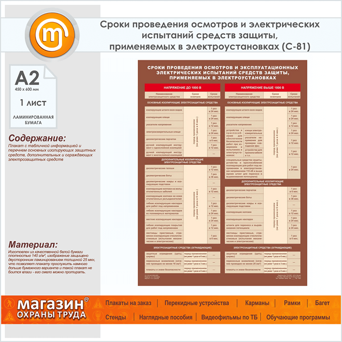 Плакат «Сроки проведения осмотров и электрических испытаний средств защиты, применяемых в электроустановках» (С-81, ламинированная бумага, А2, 1 лист) в Улан-Удэ купить