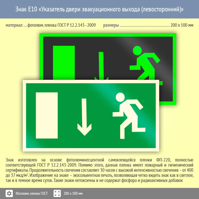 Знак E10 «Указатель двери эвакуационного выхода (левосторонний)» (фотолюминесцентная пленка ГОСТ 34428-2018, 200х100 мм) в Улан-Удэ купить