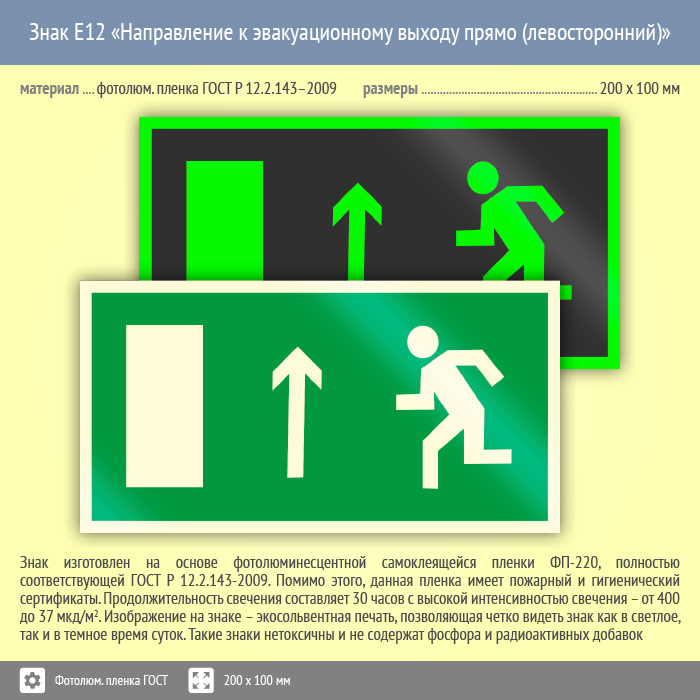Знак E12 «Направление к эвакуационному выходу прямо (левосторонний)» (фотолюминесцентная пленка ГОСТ 34428-2018, 200х100 мм) в Улан-Удэ купить