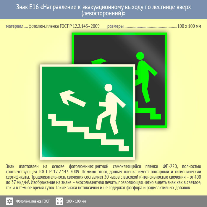 Знак E16 «Направление к эвакуационному выходу по лестнице вверх (левосторонний)» (фотолюминесцентная пленка ГОСТ 34428-2018, 100х100 мм) в Улан-Удэ купить