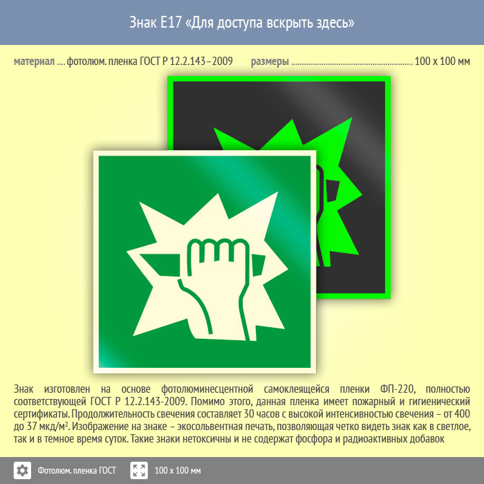 Знак E17 «Для доступа вскрыть здесь» (фотолюминесцентная пленка ГОСТ 34428-2018, 100х100 мм) в Улан-Удэ купить