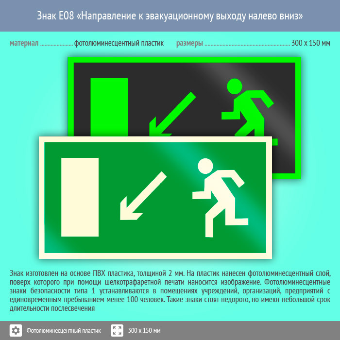 Знак E08 «Направление к эвакуационному выходу налево вниз» (фотолюминесцентный пластик, 300х150 мм) в Улан-Удэ купить