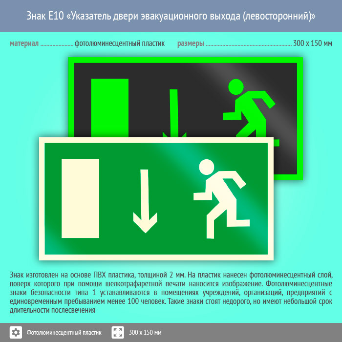 Знак E10 «Указатель двери эвакуационного выхода (левосторонний)» (фотолюминесцентный пластик, 300х150 мм) в Улан-Удэ купить
