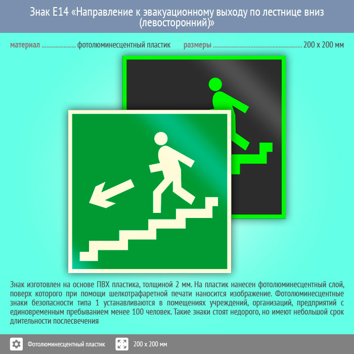 Знак E14 «Направление к эвакуационному выходу по лестнице вниз (левосторонний)» (фотолюминесцентный пластик, 200х200 мм) в Улан-Удэ купить