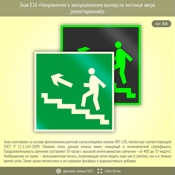 Знак E16 «Направление к эвакуационному выходу по лестнице вверх (левосторонний)» (фотолюминесцентная пленка ГОСТ 34428-2018, 150х150 мм) в Улан-Удэ купить