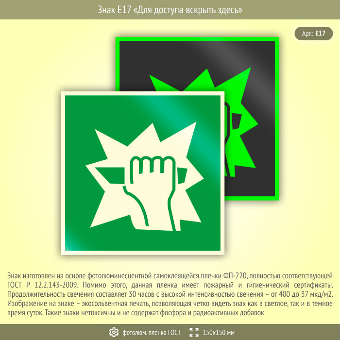 Знак E17 «Для доступа вскрыть здесь» (фотолюминесцентная пленка ГОСТ 34428-2018, 150х150 мм) в Улан-Удэ купить