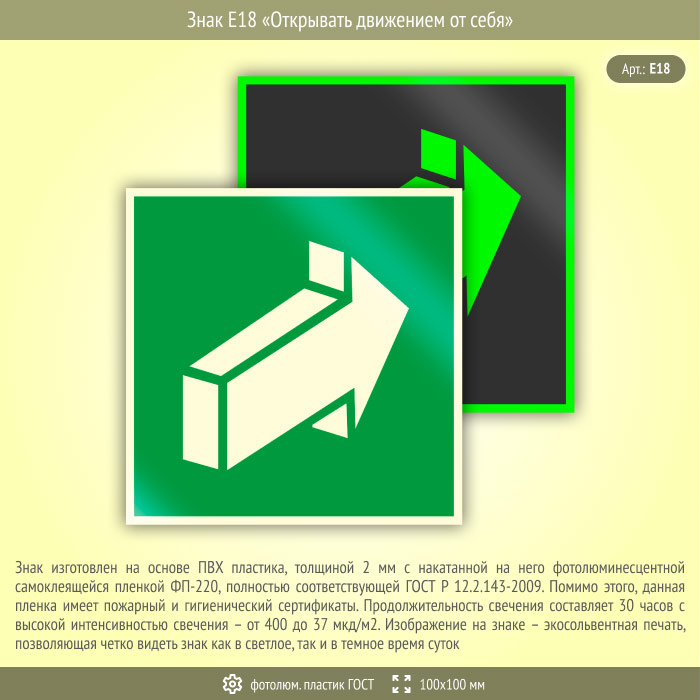 Знак E18 «Открывать движением от себя» (фотолюминесцентный пластик ГОСТ 34428-2018, 100х100 мм) в Улан-Удэ купить