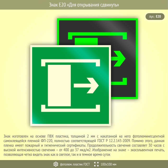 Знак E20 «Для открывания сдвинуть» (фотолюминесцентный пластик ГОСТ 34428-2018, 100х100 мм) в Улан-Удэ купить