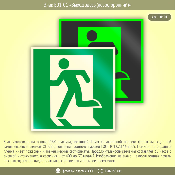 Знак E01-01 «Выход здесь (левосторонний)» (фотолюминесцентный пластик ГОСТ 34428-2018, 150х150 мм) в Улан-Удэ купить