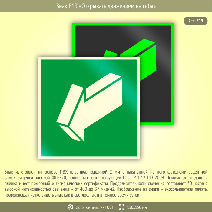 Знак E19 «Открывать движением на себя» (фотолюминесцентный пластик ГОСТ 34428-2018, 150х150 мм) в Улан-Удэ купить