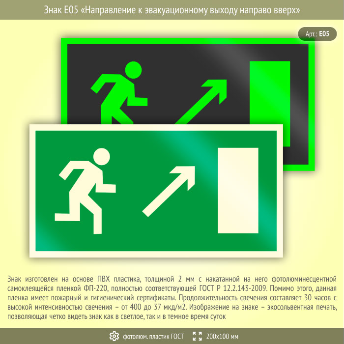 Знак E05 «Направление к эвакуационному выходу направо вверх» (фотолюминесцентный пластик ГОСТ 34428-2018, 200х100 мм) в Улан-Удэ купить