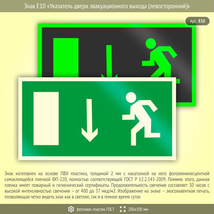 Знак E10 «Указатель двери эвакуационного выхода (левосторонний)» (фотолюминесцентный пластик ГОСТ 34428-2018, 200х100 мм) в Улан-Удэ купить