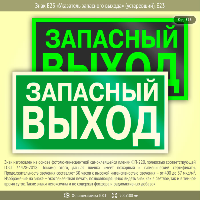 Знак E23 «Указатель запасного выхода» (устаревший) (фотолюминесцентная пленка ГОСТ 34428-2018, 200х100 мм) в Улан-Удэ купить