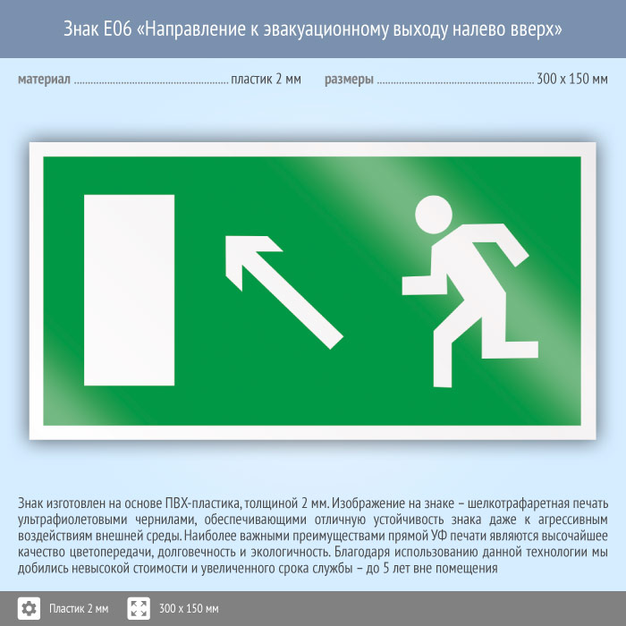 Знак E06 «Направление к эвакуационному выходу налево вверх» (пластик, 300х150 мм) в Улан-Удэ купить