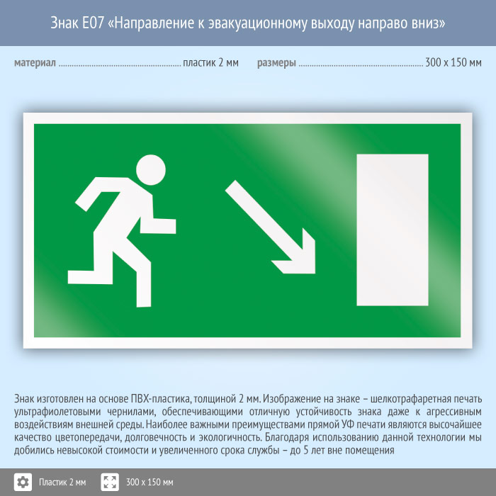 Знак E07 «Направление к эвакуационному выходу направо вниз» (пластик, 300х150 мм) в Улан-Удэ купить