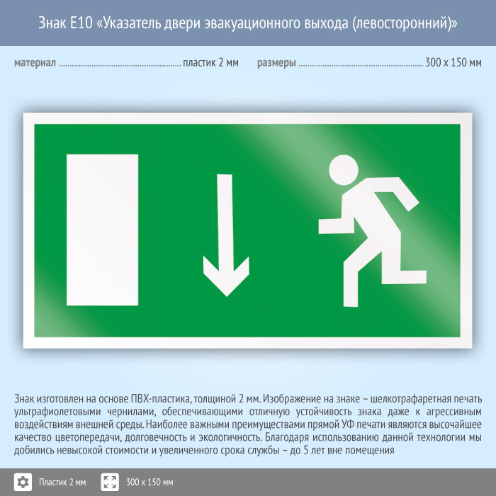 Знак E10 «Указатель двери эвакуационного выхода (левосторонний)» (пластик, 300х150 мм) в Улан-Удэ купить