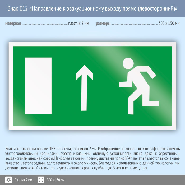 Знак E12 «Направление к эвакуационному выходу прямо (левосторонний)» (пластик, 300х150 мм) в Улан-Удэ купить