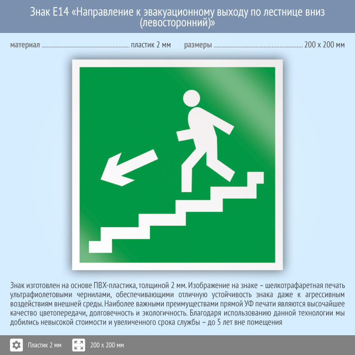 Знак E14 «Направление к эвакуационному выходу по лестнице вниз (левосторонний)» (пластик, 200х200 мм) в Улан-Удэ купить