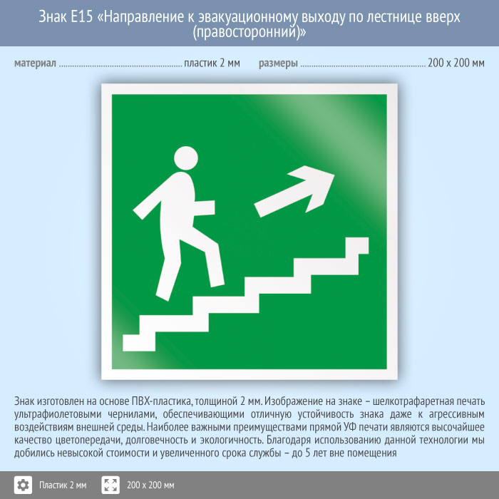 Знак E15 «Направление к эвакуационному выходу по лестнице вверх (правосторонний)» (пластик, 200х200 мм) в Улан-Удэ купить
