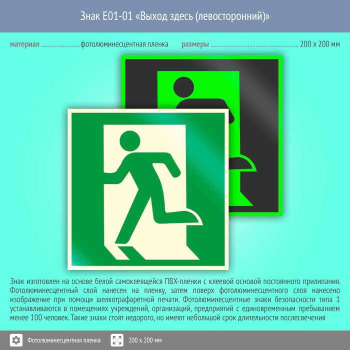 Знак E01-01 «Выход здесь (левосторонний)» (фотолюминесцентная пленка, 200х200 мм) в Улан-Удэ купить