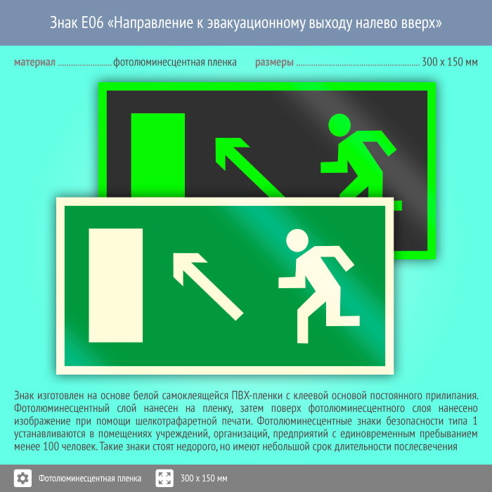 Знак E06 «Направление к эвакуационному выходу налево вверх» (фотолюминесцентная пленка, 300х150 мм) в Улан-Удэ купить