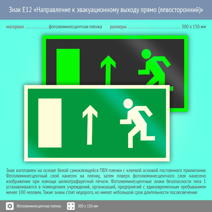 Знак E12 «Направление к эвакуационному выходу прямо (левосторонний)» (фотолюминесцентная пленка, 300х150 мм) в Улан-Удэ купить