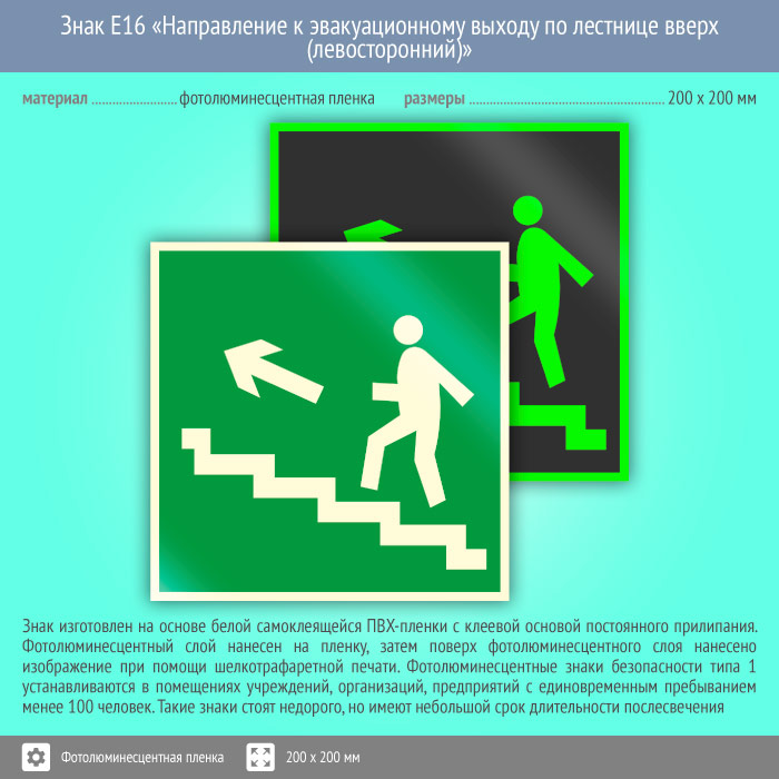 Знак E16 «Направление к эвакуационному выходу по лестнице вверх (левосторонний)» (фотолюминесцентная пленка, 200х200 мм) в Улан-Удэ купить
