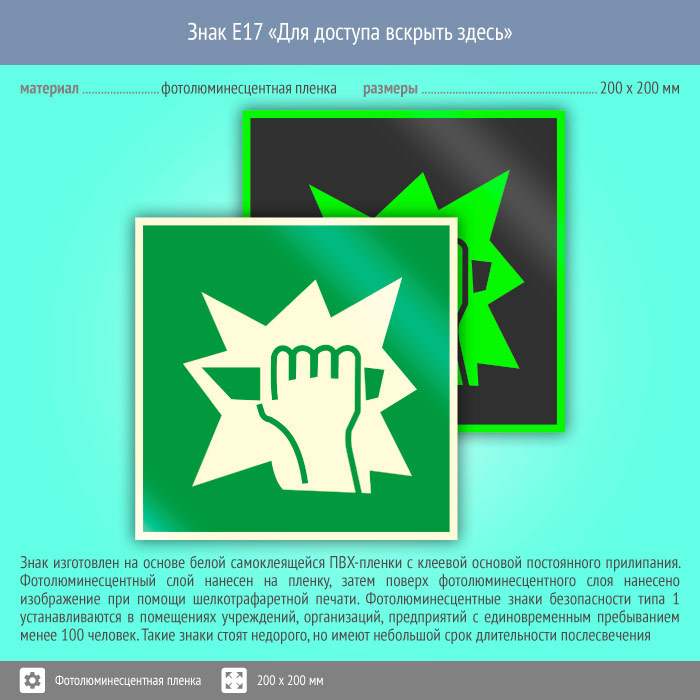 Знак E17 «Для доступа вскрыть здесь» (фотолюминесцентная пленка, 200х200 мм) в Улан-Удэ купить