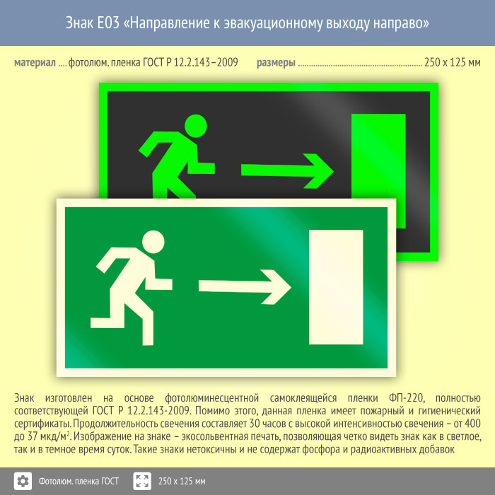 Знак E03 «Направление к эвакуационному выходу направо» (фотолюминесцентная пленка ГОСТ 34428-2018, 250х125 мм) в Улан-Удэ купить