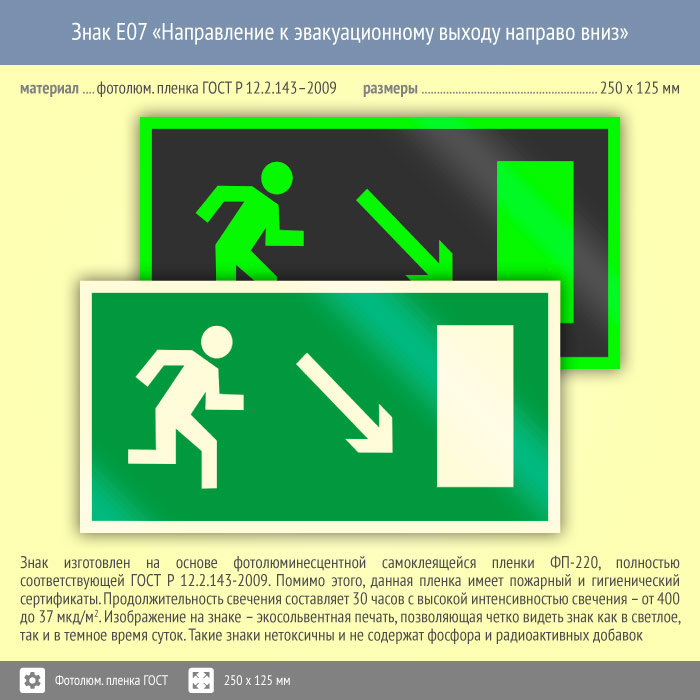 Знак E07 «Направление к эвакуационному выходу направо вниз» (фотолюминесцентная пленка ГОСТ 34428-2018, 250х125 мм) в Улан-Удэ купить