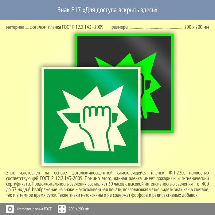 Знак E17 «Для доступа вскрыть здесь» (фотолюминесцентная пленка ГОСТ 34428-2018, 200х200 мм) в Улан-Удэ купить