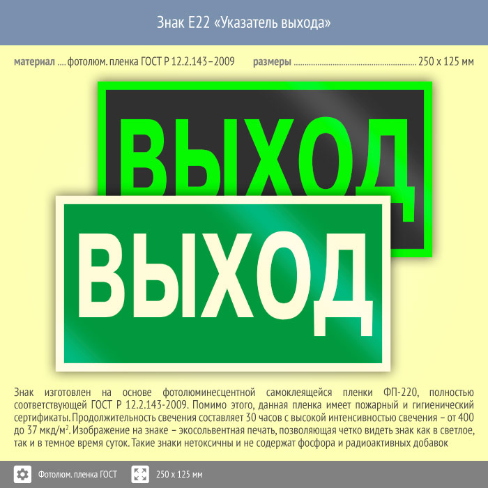 Знак E22 «Указатель выхода» (фотолюминесцентная пленка ГОСТ 34428-2018, 250х125 мм) в Улан-Удэ купить